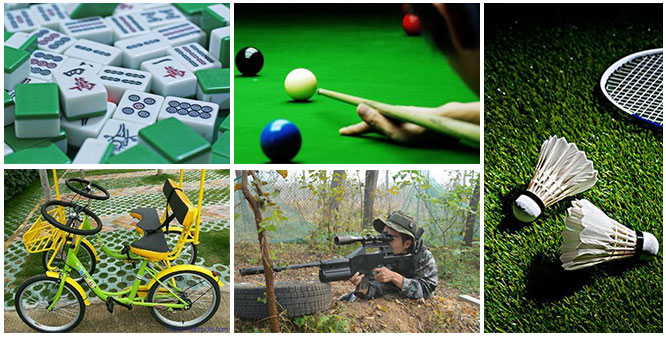 荷园还为您准备了多样化的游乐设施,如桌球、羽毛球、麻将、真人CS、双人脚踏车、喂鱼、戏水池等。希望为您和您的家人朋友增添一份乐趣。